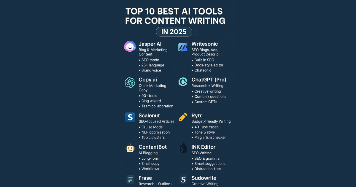 Here are the top 10 AI tools revolutionizing the content writing landscape in 2025: